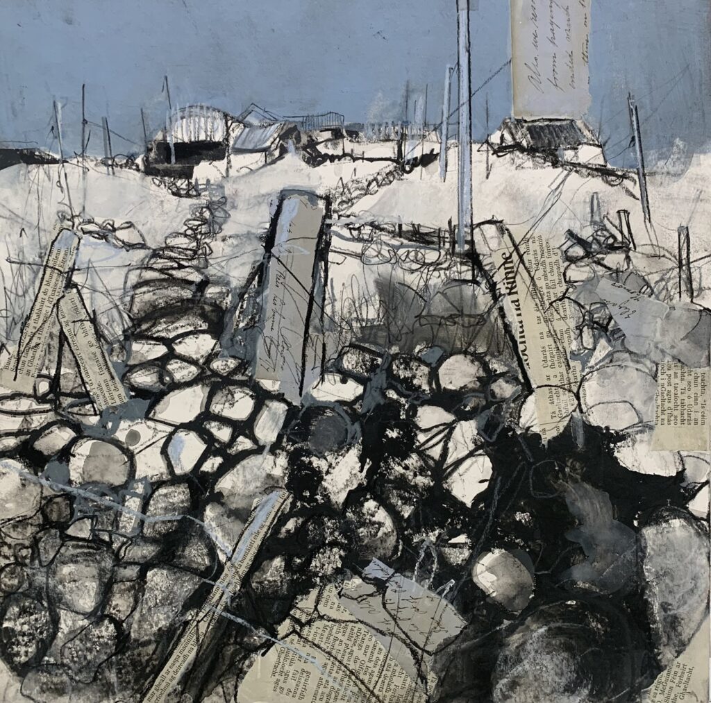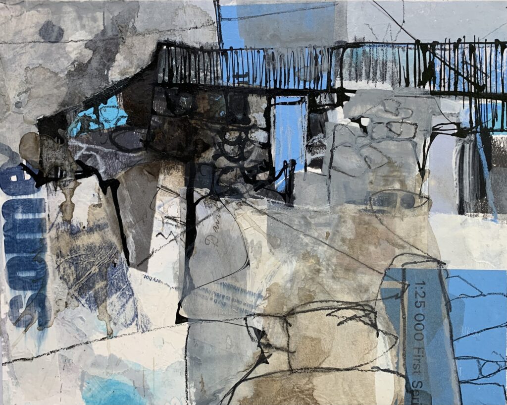Twlc Mochyn (Tangled Up in Blue II) Acrylig a collage ar fordyn pren